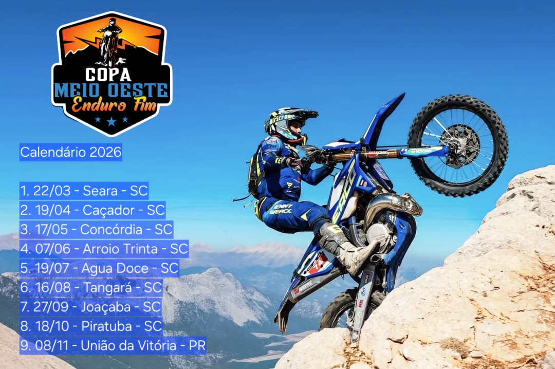 A organização da Copa Meio Oeste de Enduro Fim divulgou o calendário de 2026. Neste ano a competição acontece em nove etapas. Concórdia será sede da terceira etapa.