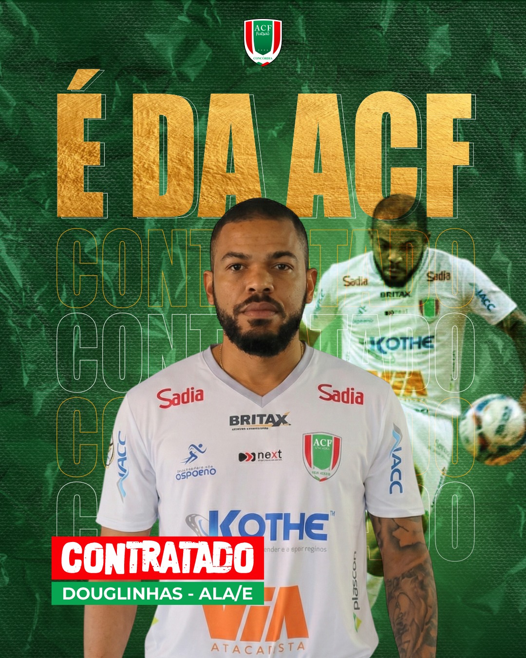 O fixo\ala esquerdo Douglinhas é o novo reforço da ACF para a temporada de 2026. Atleta volta a defender as cores do time Concordiense após oito temporadas. Pela ACF Douglinhas jogou a Liga Nacional, Estadual de Futsal e foi campeão nos JASC por Concórdia em 2017.