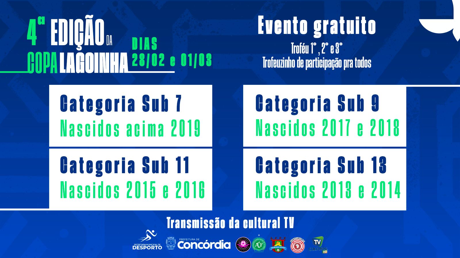 O evento conta com o apoio da Prefeitura Municipal de Concórdia juntamente com a Secretaria municipal de Desporto e grande novidade desse ano será a cobertura e transmissão ao vivo e exclusivo da Cultural TV.