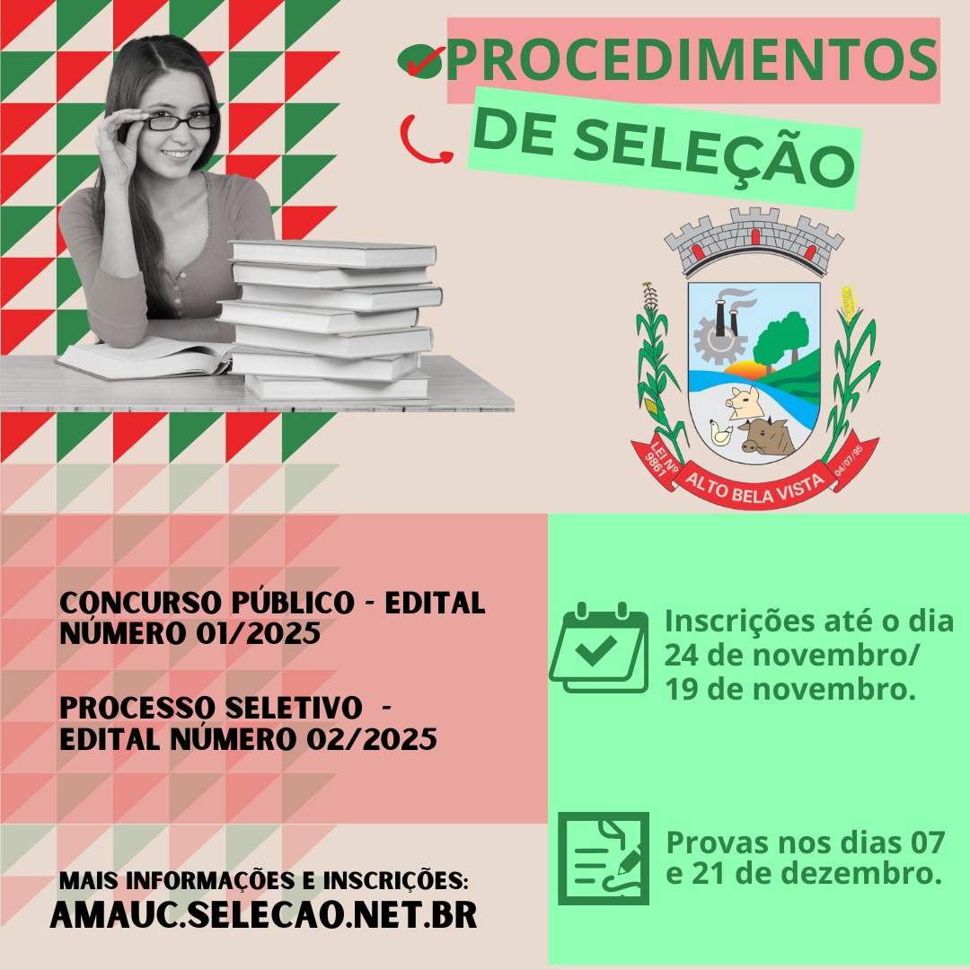 A Associação dos Municípios do Alto Uruguai Catarinense (AMAUC) informa que estão abertos os prazos de inscrições para o Concurso Público (Edital nº 01/2025) e o Processo Seletivo (Edital nº 02/2025) da Administração Municipal de Alto Bela Vista.