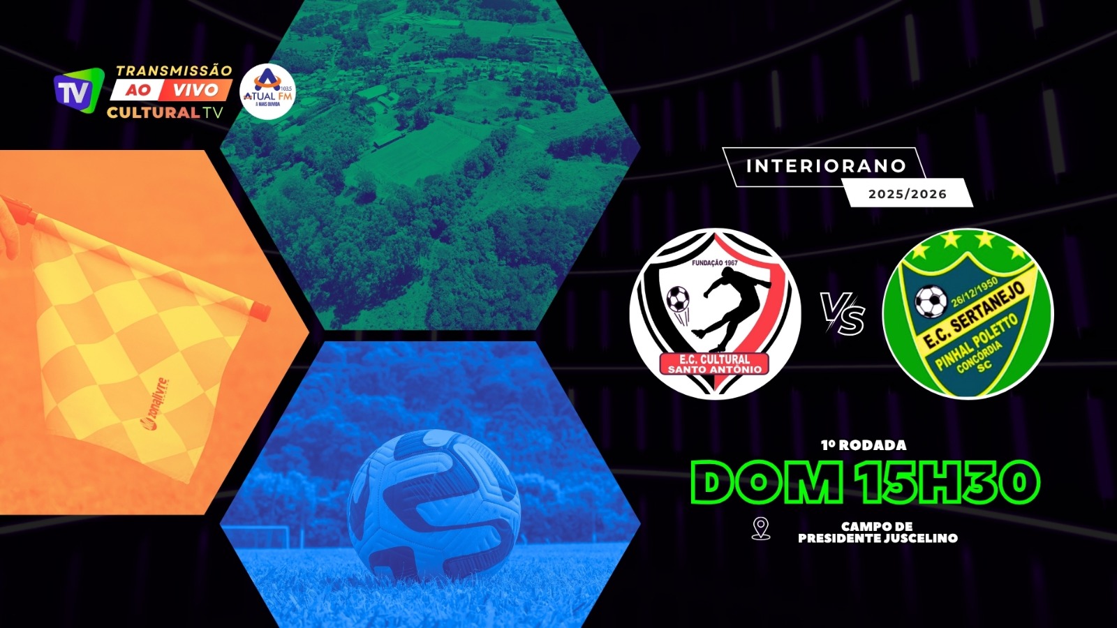 O confronto entre Santo Antônio e Poletto tem transmissão da Cultural TV e plataformas digitais da Atual FM. Jornada Esportiva tem início às 15hs.